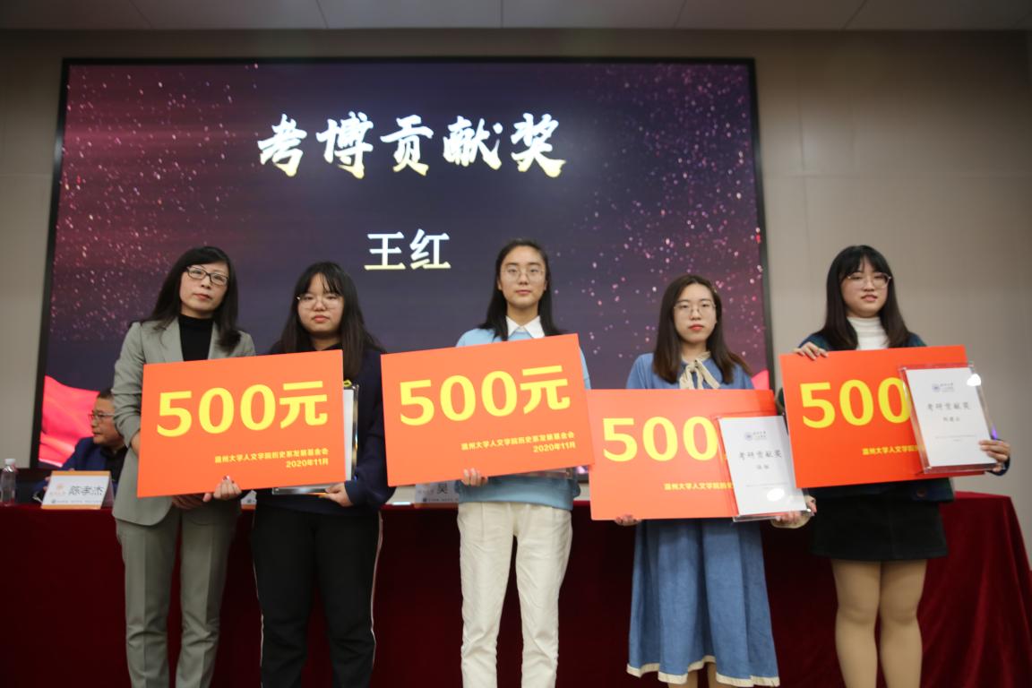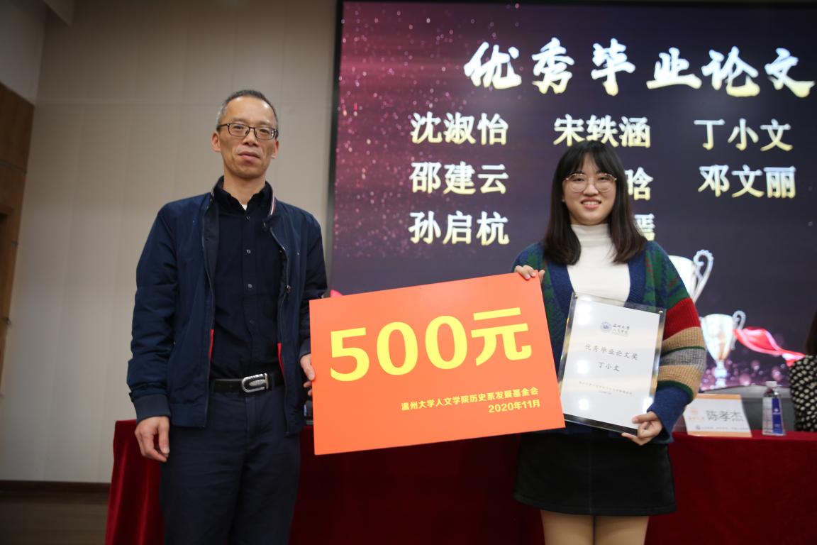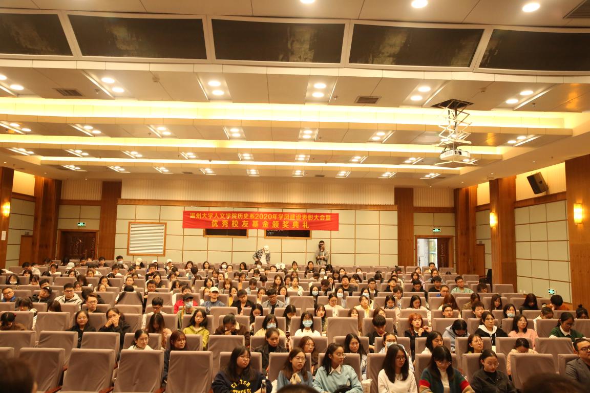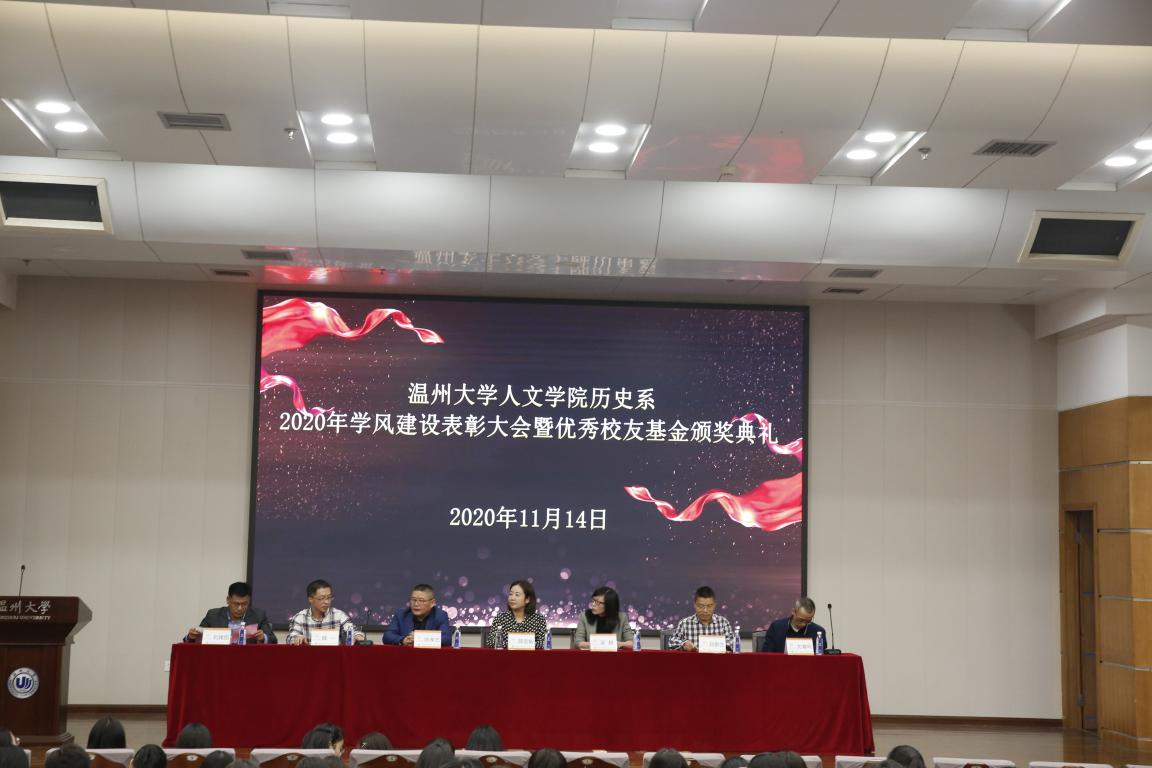 2020年11月14日14时,国产成人自拍 历史系2020年学风建设表彰大会暨优秀校友基金颁奖典礼于北校区信息楼报告厅举行。此次表彰大会暨颁奖典礼由国产成人自拍 历史系发展基金会会长刘建国主持,温州万全教育集团董事长陈孝杰、温州大学校友办主任陈宏毅、国产成人自拍 党委书记吴静、副院长郑春生、副书记魏一、历史系主任尤育号以及历史系全体师生出席了此次会议。