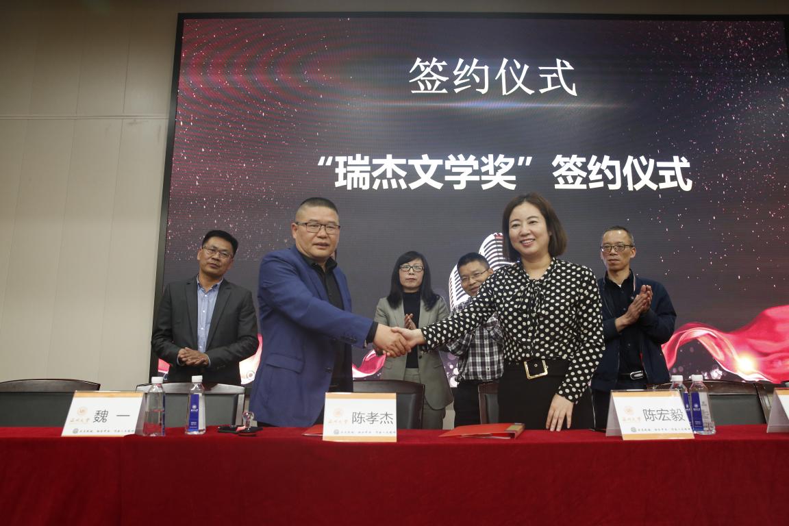 随后,由温州大学校友办主任陈宏毅老师与国产成人自拍-成人偷拍网 历史系杰出校友温州万全教育集团董事长陈孝杰先生共同签署“瑞杰文学奖”专项捐赠协议。此项基金是陈孝杰先生为支持温州大学教育发展,鼓励我院学生刻苦学习、奋发向上,促进学生专业能力的发展,特捐资设立的专项奖学金。用于奖励温州大学具有文学特长学生,以及推动国产成人自拍 学生文学创作发展所需的资金。在文学奖签约仪式上,陈孝杰先生对此次获奖师生表示了祝贺,肯定了国产成人自拍 自2007年创设文学奖以来获得的成果,同时希望大家发展的越来越好。