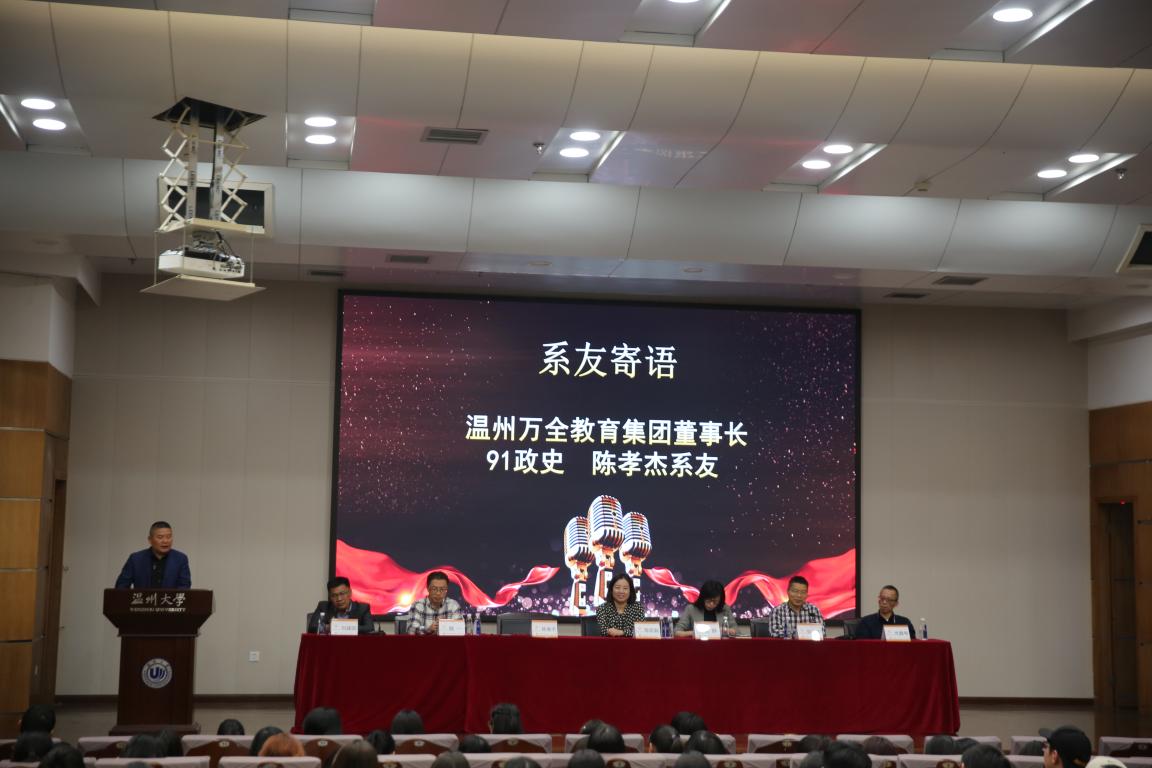 2020年11月14日,经前期协调沟通,温州万全教育集团为国产成人自拍-成人偷拍网 捐资设立的“瑞杰文学奖”签约仪式在温州大学北校区信息楼报告厅隆重举行。出席仪式的有国产成人自拍-成人偷拍网 历史系校友温州万全教育集团董事长陈孝杰、温州大学校友办主任陈宏毅、人文党委书记吴静、副院长郑春生、副书记魏一、系主任尤育号和历史系发展基金会会长刘建国,以及历史系全体师生。