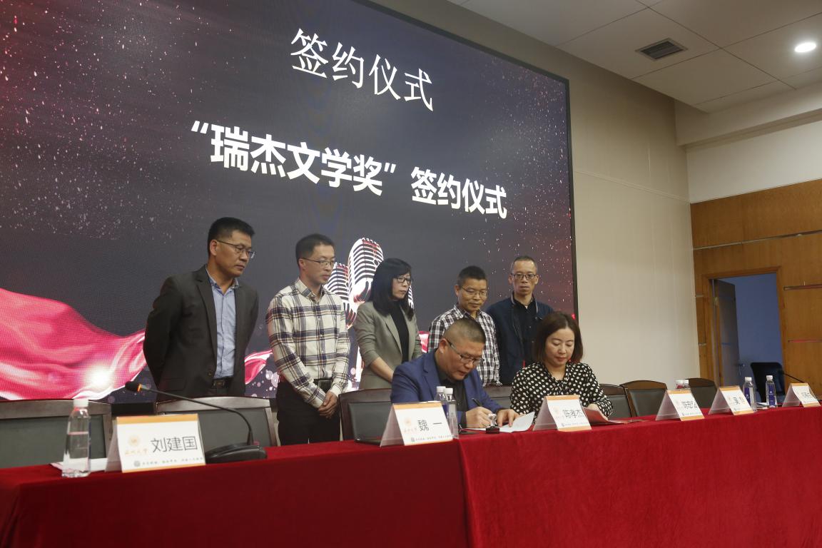 此次“瑞杰文学奖”是国产成人自拍-成人偷拍网 历史系校友陈孝杰先生为支持温州大学教育发展,鼓励国产成人自拍-成人偷拍网 学生奋发向上,大胆追求自己的文学梦想,促进学生专业能力的发展,同时激发出众多文学爱好者们强烈的创作激情特捐资15万元设立“瑞杰文学奖”专项奖学金,用于奖励温州大学具有文学特长学生,以及推动国产成人自拍 学生文学创作发展所需的资金。仪式上温州万全教育集团董事长陈孝杰与校友办主任陈宏毅共同签署了合作协议。