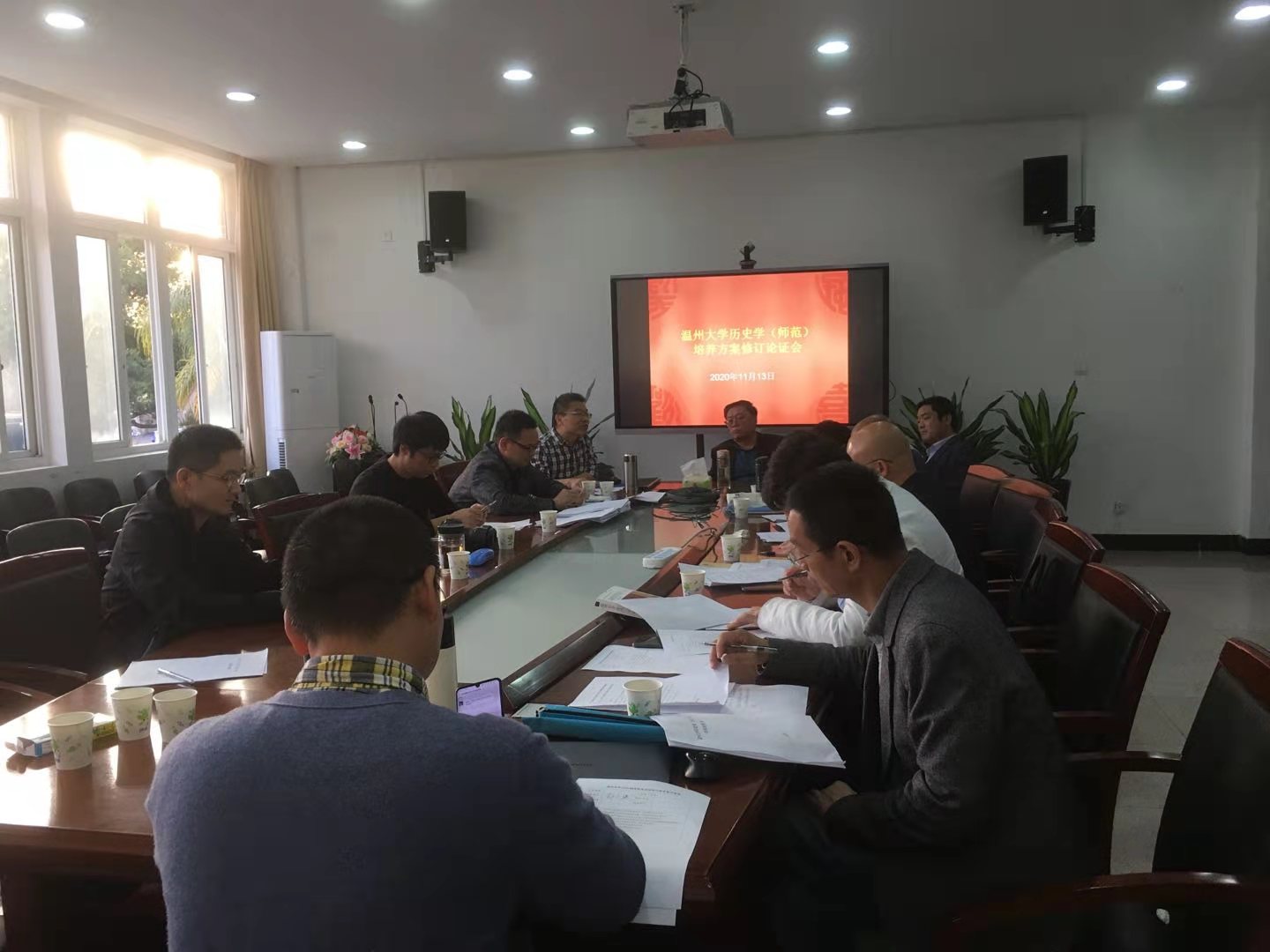 2020年11月13日下午,历史系在国产成人自拍 213会议室召开历史学(师范)专业培养方案修订论证会。来自温州中学一线的历史教学名师蔡永、方军、黄静、王少莲、夏陈伟、项洪文、肖云豹、徐乃赛、赵庆东、郑小侠和历史专业骨干教师参加了论证会。会议由国产成人自拍 副院长、历史专业负责人郑春生教授主持。