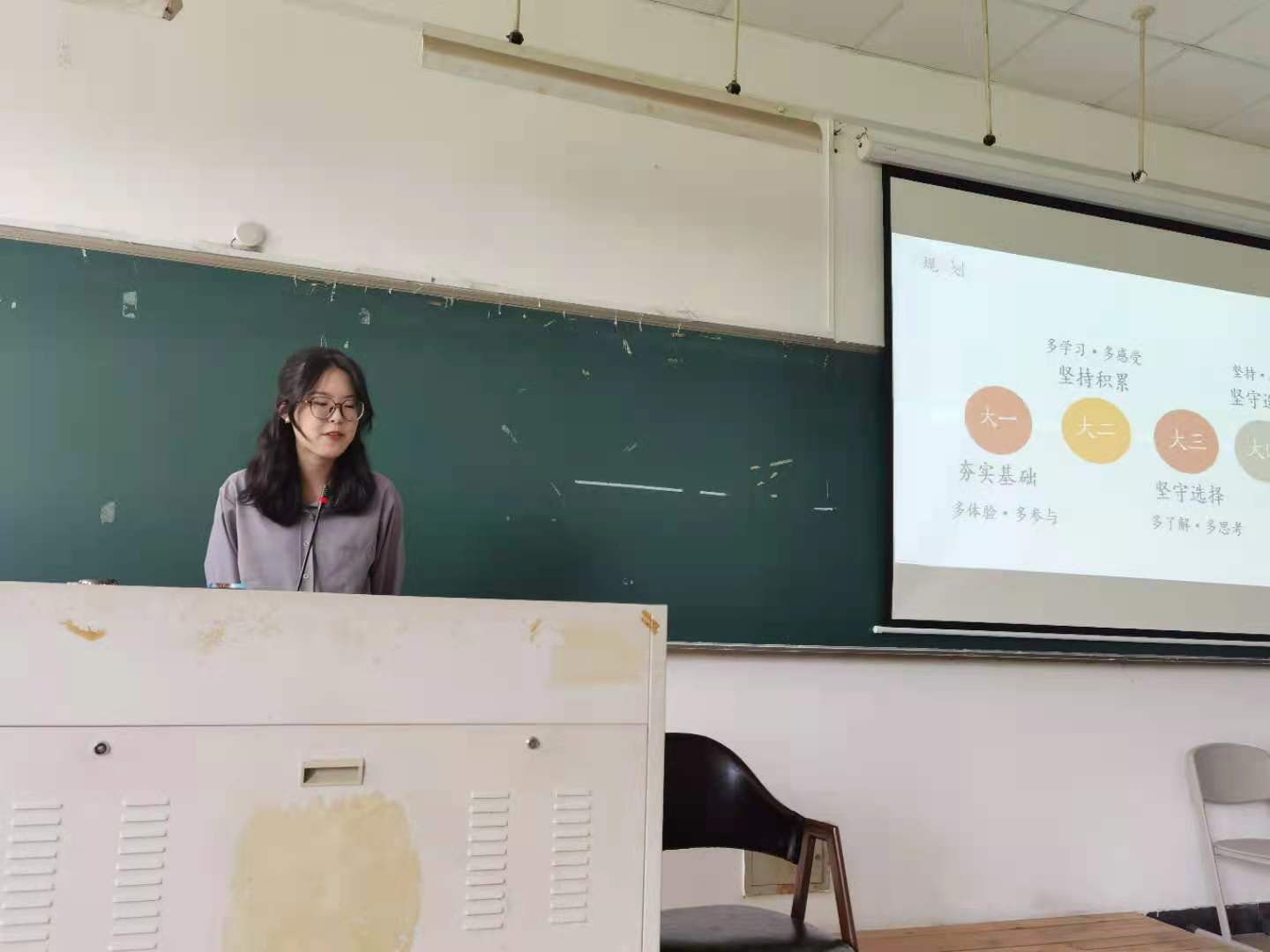 (一)周一上午9:30——11:30,在国产成人自拍 201教室,17级优秀毕业生徐婕、侯宇欣和洪苗苗为19级的学弟学妹们做了经验分享报告。