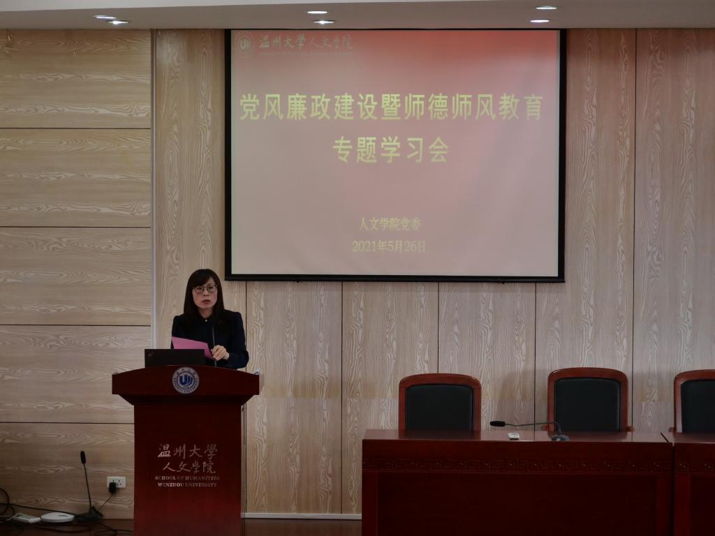 为加强党风廉政建设,树立良好师德师风,进一步规范教师职业行为,会议随后进行了党风廉政建设暨师德师风教育专题学习会。吴静书记首先传达了学校全面从严治党大会会议精神,通报了党的十八大以来国内、省内高校和我校发生的违规违纪违法典型案例,以案说纪、以案说法、以案说德,为全院教师上了一堂生动的纪律教育公开课。她还结合“清廉学院”建设方案,围绕“清明政风、清正教风、清新学风”建设目标,要求全体教师在日常教学科研工作中始终坚持 “遵守政治纪律,遵守学术规范,遵守财务规定”三项基本要求,牢固树立以清为美、以廉为荣的价值理念,齐心协力打造“清廉人文”。