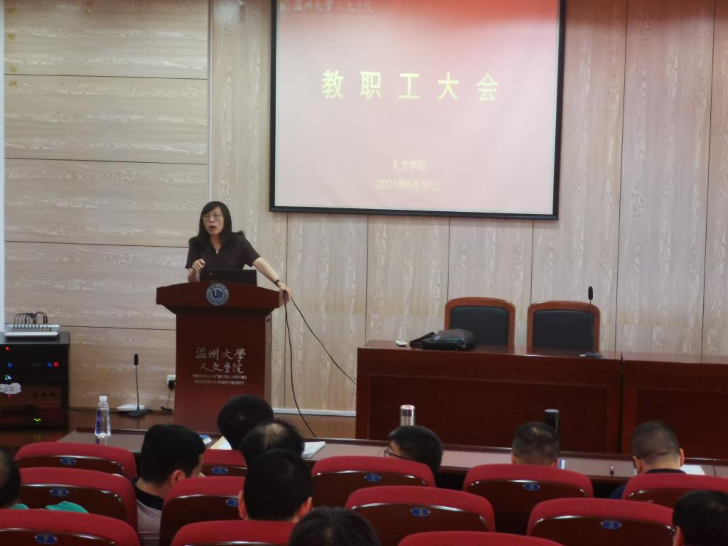 6月29日下午,国产成人自拍 在203报告厅召开了全体教职工大会。学院领导班子及全体教职工参加本次会议,会议由学院党委书记吴静主持。