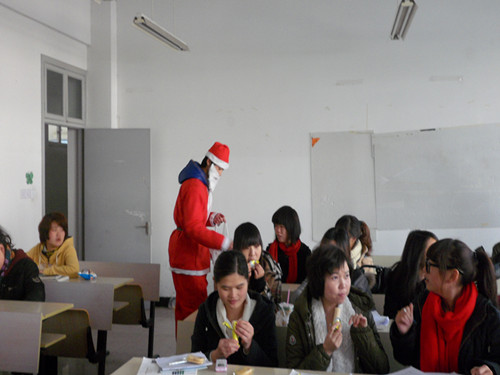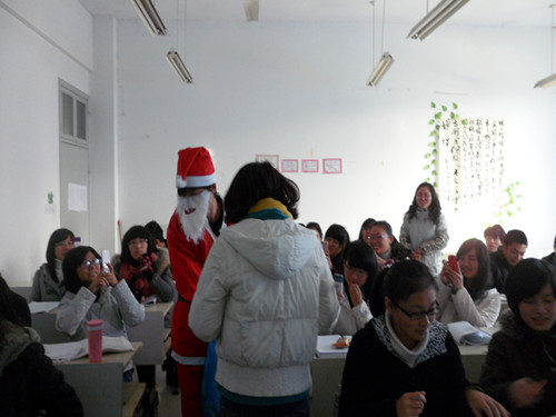 当天,学生会的几个男干事们在办公室换好装,带着圣诞礼物--小零食,和由学生会女生扮演的小麋鹿一起进班级为同学们送去节日祝福。一推开教室门,圣诞老人对着一脸惊讶的同学们高喊:"MERRY CHRISTMANS!圣诞快乐!同学们!"同学们快乐地尖叫起来,纷纷围上来问圣诞老人要礼物。小麋鹿蹦跳着,两手捧着苹果,送给上课的老师,送上节日的祝福。圣诞老人到过的每一个教室都充满了欢乐和惊喜,人文楼的课间一下子变得热闹起来。同学们交换着分得的零食,还有些跑上来和圣诞老人拍照。