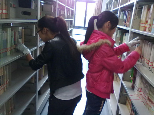 10中本3班的十几位同学继上星期参加义务整理图书馆活动后,又一次参加图书馆整理活动。