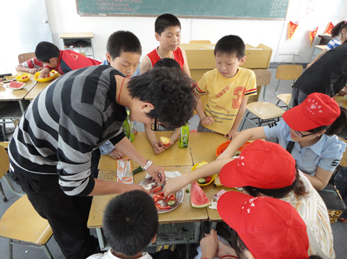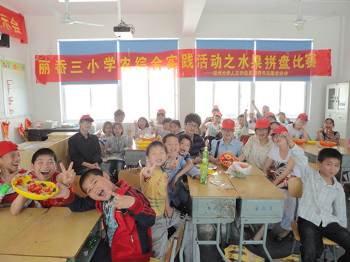 上午7点半,在沁人心脾的樟树的香气中,志愿者准时准点地到达集合场地。本次活动主要有两部分组成,先进行由志愿者上台讲解关于植物的相关知识,并融合相关的智力竞猜,小朋友们在志愿者的鼓动下,各个都积极发言。为了加强志愿者与孩子的互动与交流,讲课结束之后,又进行了根据植物性状猜植物名称的游戏,小朋友们都积极参加。一系列的热身之后便是本次活动的主要内容,"水果大拼盘比赛",全部的成员被分为五个组,每个组由三个志愿者作为指导,为了充分发挥孩子的想象力与创造力,志愿者只是作为辅助指导,大部分都是由孩子们自己的成果。有个小组将黄瓜切成鱼鳞状,作为海面,将番茄切片作为太阳,用黄果皮组成鱼儿,经过紧张的比拼,比赛分别由观众投票以及综合评定,角逐出了一等奖二等奖各一名,以及最佳创意奖与最佳组织奖。其中,名为"神龙摆尾"的小组得了第一名。