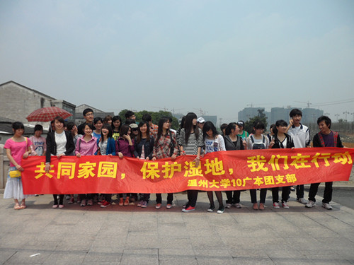 10广告本全体同学在温州三垟湿地开展主题为"地球,共同的家园,保护湿地,我们在行动"的团日活动,本此活动中同学们将以志愿者的身份在三垟湿地宣传如何保护湿地的知识。