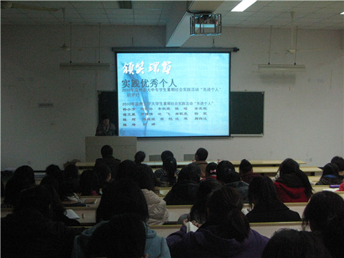 “探究温州民企社会责任慈善助学模式调研”暑期社会实践队荣获了2010年温州市大中专学生暑期社会实践活动“优秀团队”的称号。然后,温州大学实践中心负责人张建增为大一同学做了2011年暑期社会实践活动方案指导,意在让大家对社会实践活动有更加明确的了解。随后,麻老师对暑期实践活动做了进一步的总结。麻老师指出“受教育,长才干,做贡献”是我们举行这个活动的主要目的。他还通过大学生为留守儿童和农民工子弟补课等例子生动地为大家讲解了实践活动对学生和社会的意义。最后,荣获“优秀团队”称号实践队的队长罗倩倩和沈芳展示了各自团队在暑期实践活动中的风采。
