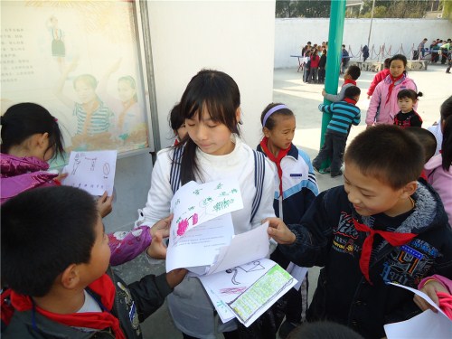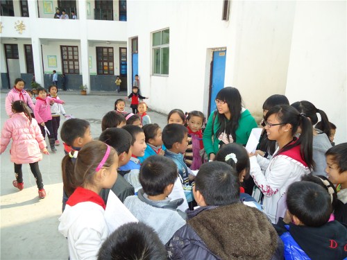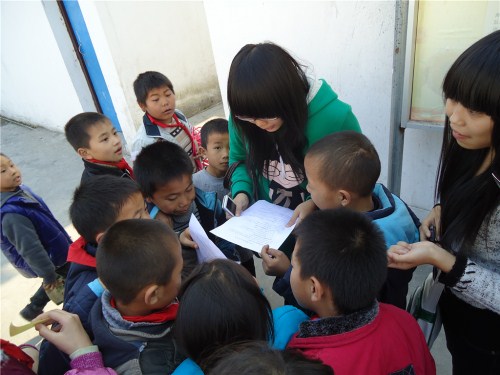 14点左右,孩子们来到操场。志愿者们分成几个小组分头行动,首先是给孩子们分发消防知识的传单,之后志愿者们通过简短的询问和讲演吸引小朋友们参加到自己的组内参加活动。整个支教活动包括两个环节,首先是给孩子们讲解消防知识,然后是通过游戏进行有奖问答。其中最受学生欢迎的无疑是“踩报纸”的游戏环节了,每个组的孩子们都很兴奋,希望通过自己的努力成为最后还站在报纸上的那个人。这次志愿活动一直持续到4:30才圆满结束。