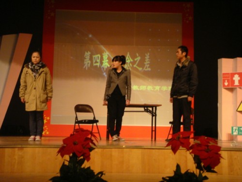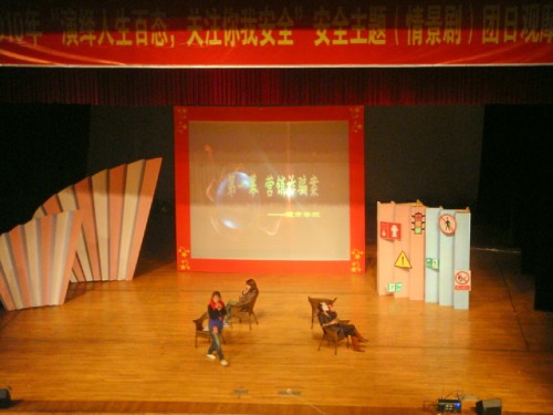 情景剧开幕之前,温州大学保卫处副处长张有全老师做了简短的校园安全形势通报,呼吁广大同学提要防范意识,增强技能,做好校园安全工作。接下来进行的是精彩的情景剧表演,城市学院表演的《营销诈骗案》讲述了在校大学生为经不住骗子高额创业回报幌子下的诱惑,向同学借钱购买了"海飞丝"洗发水的故事;而瓯江学院表演的《醉酒之后》,则讲述农村大学生醉酒之后致人轻伤,其母亲为赔付受害学生人身损害赔偿以至卖地筹资境况的故事,不过故事结尾双方达成和解的也体现了大学生相亲相爱一家人的主旋律;音乐学院表演的《球场风波》、教师教育学院表演的《一念之差》从不同角度揭示了校园财产安全隐患,呼吁广大同学提高警惕妥善保护自己财产;最后出场的是国产成人自拍