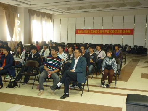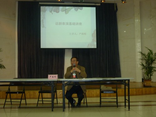 党总支副书记骆锤炼老师为大家讲解了本届温州大学话剧节的相关事宜,包括话剧剧本的要求,LOGO设计大赛,表演大赛和奖项设置。骆老师的细心讲解和要求使同学们进一步明确了参赛的规则和程序。接着严教授进行了话剧表演基础的专题讲座。 第一强调了话剧的特点:内容上反映现实和形式上主要由语言,动作,表情来展现等。第二教大家怎样导演小话剧:其中包括分析剧本,导演构思,导演阐释,排练和修改等几个方面 ,为同学们参赛提供了正确的引导。第三主要讲解了“怎样表演好话剧”。严教授告诉大家演好话剧一定要敢于表现从而挖掘规定情景,并且要以假当真,身临其境,思考剧本的台词挖掘潜台词等。