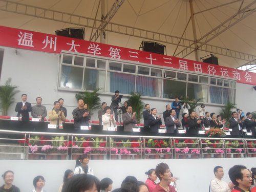 10月27日上午,温州大学第三十三届田径运动会正式开幕。校领导陈福生、蔡袁强、林娟娟、任柏强、吴金法、叶世祥、蔡曙光以及相关部门、各学院负责人出席开幕式。
