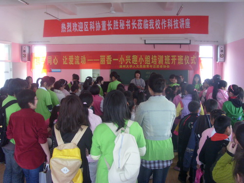 8点30分,兴趣班开班仪式正式开始。首先是丽岙一小老师的简明扼要的讲话,强调了本次活动的意义,并鼓励同学们好好学习。接下来是志愿者代表发表演讲及志愿者作品展示。9点15分,小朋友们在志愿者的带领下返回教室,开始了他们的兴趣班课程,内容包括美术、书法、剪纸折纸、贴画、趣味体育等12种。课堂氛围积极活跃,效果良好。