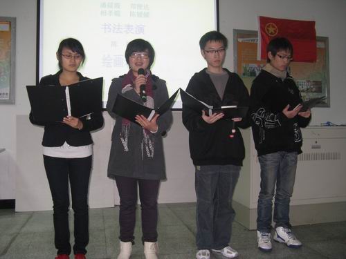 震撼人心的一二·九视频观看后,08历本和09中本三班的同学为观众们带来了情景剧表演、历史背景解说、知识竞答和诗朗诵、书画展示等精彩节目。由陈辉、相孝锟等主演的话剧节预赛夺魁剧目《画魂》更是赢得满堂喝彩。而后的跳绳比赛和托乒乓球比赛等趣味小游戏把现场的气氛推到了高潮,大家在笑声和鼓掌加油声中完全融入到了活动中去。小游戏过后,嘹亮的大合唱《我的中国心》唱出了台上同学对祖国的一腔深情,而台下的观众则用笔写下了自己对祖国的美好祝福。