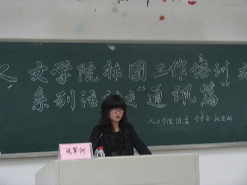 首先,沈军洲同学向同学们简单地讲解了通讯的特点、种类、写作要点等基本概念,并以一些优秀通讯为例,具体分析了人物通讯、时间通讯、工作通讯、概貌通讯、小通讯等常见通讯的写作方法。接着,她又结合自己的工作经验和《温州大学报》的优秀通讯实例向同学们介绍了采访和消息写作的主要流程和相关注意事项。最后,沈同学以近日的话剧节预赛为题,请同学们进行现场消息写作,并对部分同学所写的消息进行了点评,从而进一步加深了同学们对消息写作的认识与理解。晚上8点,培训在同学们热烈的掌声中结束。