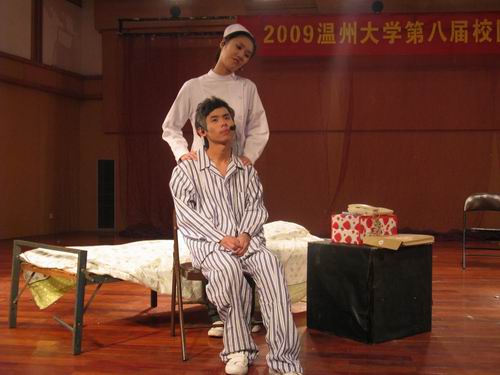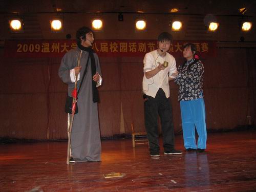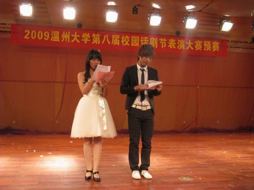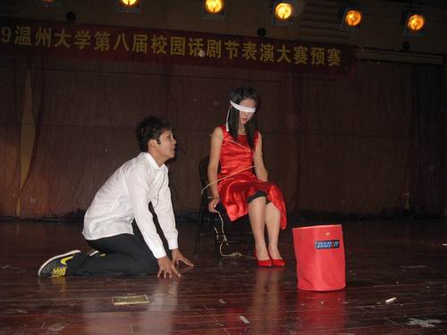12月5日早上8点30分,2009温州大学第八届校园话剧节表演大赛预赛在北校区音乐厅隆重举行。本次比赛旨在活跃我校学生课余生活,丰富校园文化建设。来自十四个学院及农历剧社的29组剧目参加了此次比赛,其中包括国产成人自拍