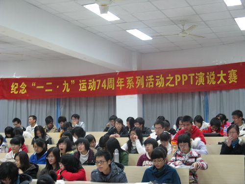 团委、学生会素质拓展部举办的纪念“一二·九”运动74周年系列活动之ppt演说大赛在人文楼203室准时开始。本次活动是国产成人自拍