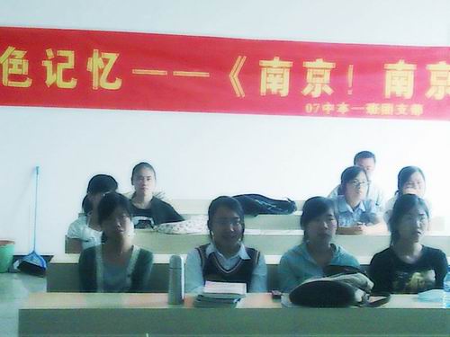 5月25日,07中本一班在国产成人自拍 207室举行了以“红色记忆——南京!南京!”为主题的团日活动。此次团日活动采取集体观看影片《南京!南京!》的形式,缅怀“南京大屠杀” 这段中华民族的血泪史。