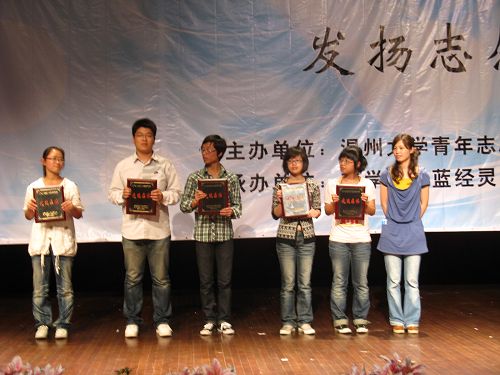 思源青年志愿者协会荣获了“2007-2008学年温州大学青年志愿服务队先进集体”和“优秀志愿服务基地”两项大奖。副主任王柄伟同学和执行主任谢慧为获奖队伍颁发了奖。同时,活动还通过座谈的形式对“五马基地”和“两项计划”作了相关的介绍,让同学们对志愿者活动有了更加深入的了解。最后,活动在感人的诗歌朗诵--《中华--不屈的民族》中圆满落幕。
