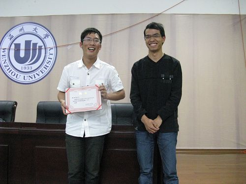 辅导员麻法全老师为本次讲座的主讲人——来自08中本二班的大一新生沈阳阳颁发了“温州大学第七届百年语文之鹿鸣讲坛特邀客座讲师(学生)”的聘书,国产成人自拍