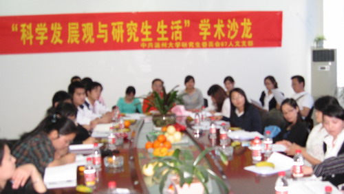 科学发展观与研究生生活之间究竟有无内在的联系,如何用科学发展观来指导研究生生活,如何统筹处理研究生生活中出现的各种矛盾,如何坚持以人为本、使自己与目前见“物”不见“人”的制度相协调,如何用坚持发展为第一要务与坚持可持续发展的辨证观点来指导研究生工作,是本次沙龙的主要内容。来自各个总支的研究生畅所欲言,就如何用科学发展观来指导自己专业发展、生活、学习、交际等方面交流了自己的学习心得。与会的魏成春书记与李慧老师也及时发表幽默而启人深思的意见,气氛热烈和谐。