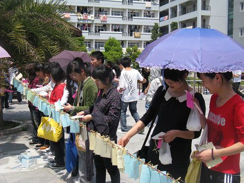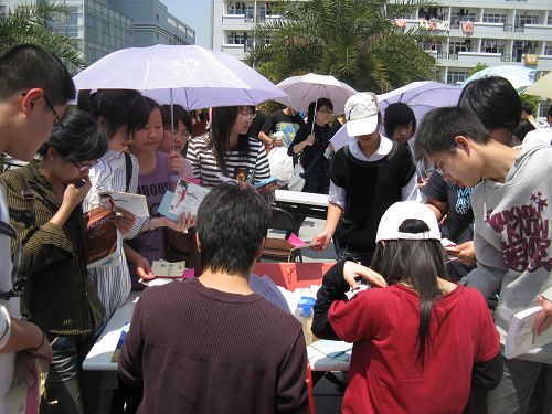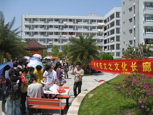 2009年4月15日12:00,温州大学第七届百年语文之“文化长廊”在生活区C区中心花园拉开帷幕,学生科科长李浦豪老师、辅导员曾蓓蕾老师、麻法全老师也来到活动现场进行指导。
