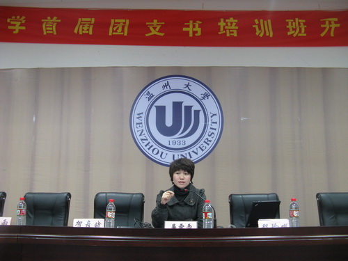 团委和数学与信息科学学院团委学生会承办的温州大学首届团支书培训班开班仪式及第一课在北校信息楼报告厅准时开始。屠霁霞老师、本次培训班的班长程雨珊同学、贺彦斌同学、朱晓雨同学以及全校各班的团支书来到了本次培训班的开班仪式。此次培训班的第一课共进行两天,包括三个活动。