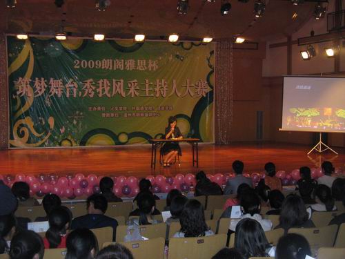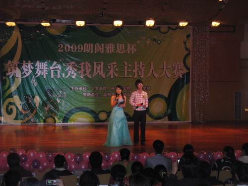 、法政学院、外国语学院联合举办的2009"朗阁雅思杯"筑梦舞台、秀我风采主持人大赛决赛在北校音乐厅隆重举行。此次大赛的目的在于繁荣校园文化,推进大学生素质拓展,选拔具有一定艺术修养和文化品位的同学代表各院参加学校的决赛。担任此次评委的有丁久萍、杨小敏、陈建跃老师.