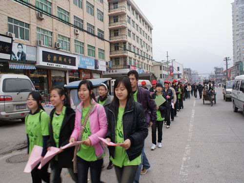 下午1:30分,大家来到了丽岙镇政府。在经过一些安排后,志愿者们便向目的地上坦村出发。一路上,志愿者们将植树护溪的倡议书分发给村民,宣传环保意识。到了上坦村后,大家与其他的志愿者一起,沿着河岸种起了树。志愿者们握着铲子,挥舞着锄头,卖力的将一个个樟树树苗种下去。有的志愿者还将彩带系在树上。虽是有绵绵细雨,但丝毫挡不住大家的热情。最后,在大家的努力下,这些树苗都种了下去,组成了一片"共青林"。