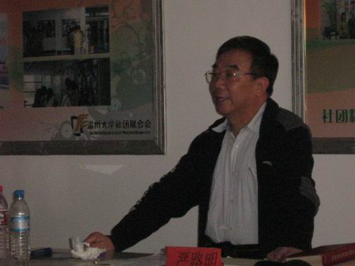 下午2:00整,参加这次活动的所有成员准时到场认真听取了严路明老师的指导讲座。首先严老师介绍了中国话剧事业的发展史以及温州话剧事业的所经历程,并着重赞扬了自2002年举办至今的大学生话剧节。接着,严老师也针对现在大学生在编、导、演话剧中所存在的问题进行了一定的批评,同时进行了细致的指导,并针对现场问题提出了他的要求。他强调话剧还是应该回归传统,多参考,多借鉴经典剧目。