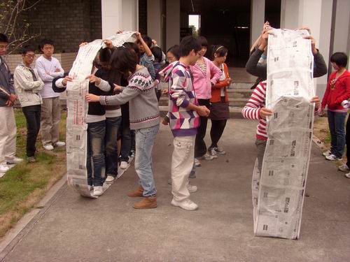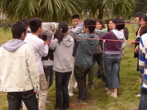 早上8:30分,活动开始。劲爆的音乐点燃了队员们的激情,教室里一改往常的严肃气氛,大家都在此刻随着音乐尽情地释放自己的压力。主讲师一直“鼓动”大家放松自我,兴奋地一起“HIGH”。随后,活动场地换到室外。此后,大家更是积极地参与其中,背摔、越狱、坦克链……特别是坦克链,大家积极地为自己的团队献计献策,游戏还引来了其它学院学生的围观并得到好评。