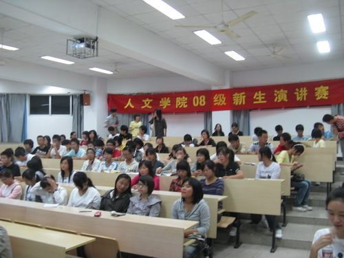 203正式开始。诗人熊国太老师、辅导员曾蓓蕾老师、麻法全老师以及07级新生演讲赛一等奖获得者黄剀元同学担任了本次比赛的评委。