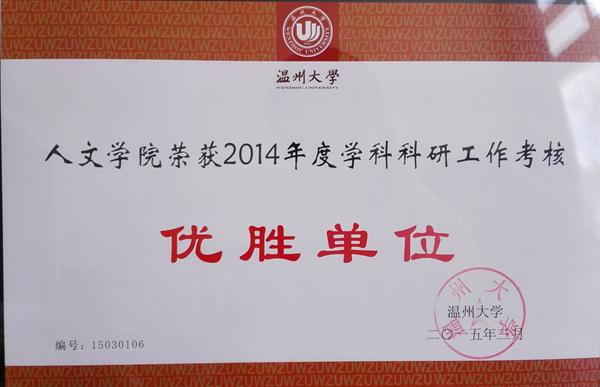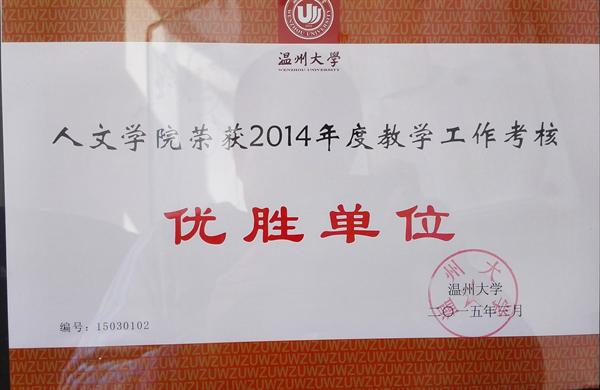 学校开展2014年度各项工作考核评选,依据考核结果,经校党委会研究决定,国产成人自拍 分获温州大学2014年度教学工作考核优胜单位和学科科研工作考核优胜单位,并予以表彰。这也是国产成人自拍 首次在教学和科研学科两方面同时荣获优胜单位,相信今后学院将会再接再厉,再创佳绩,为温州大学的发展做出努力。